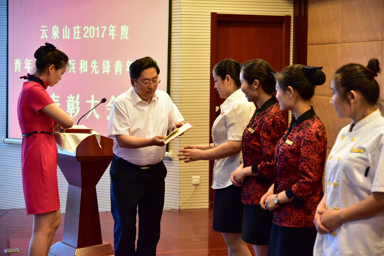 5月27日下午,云泉山莊召開(kāi)2017年度青年服務(wù)標兵和先鋒青年團隊表彰大會(huì ),楊國華副總經(jīng)理宣讀表彰決定,李中亞總經(jīng)理為獲獎員工頒發(fā)證書(shū)。